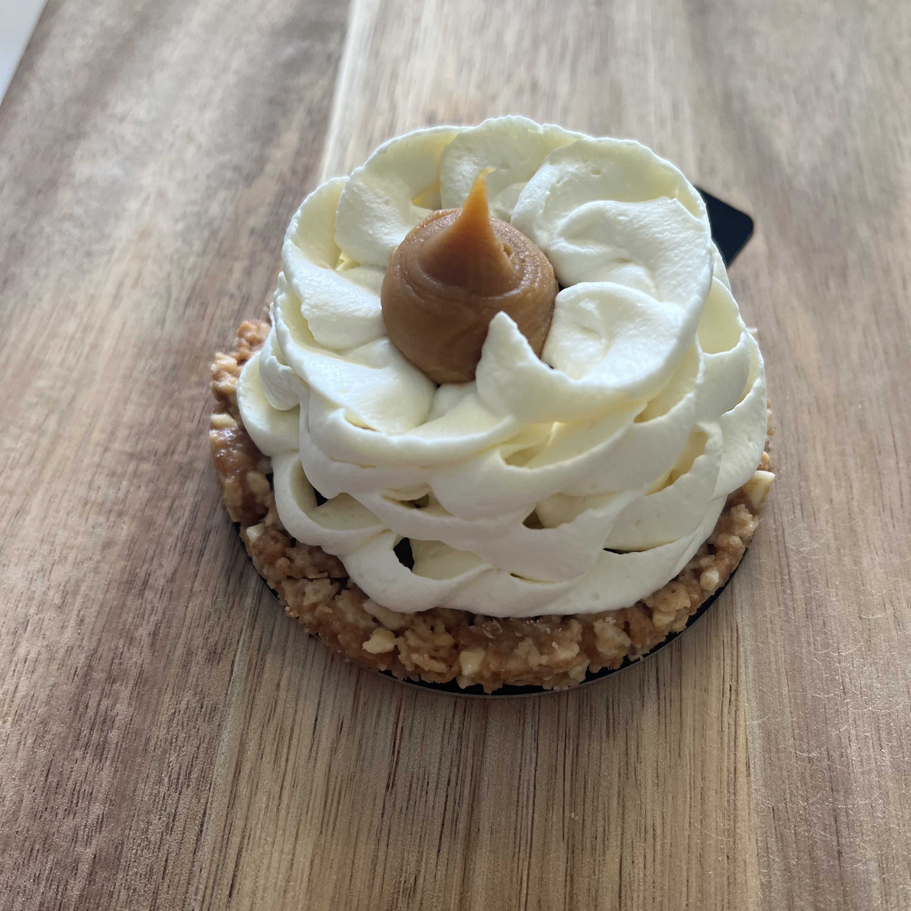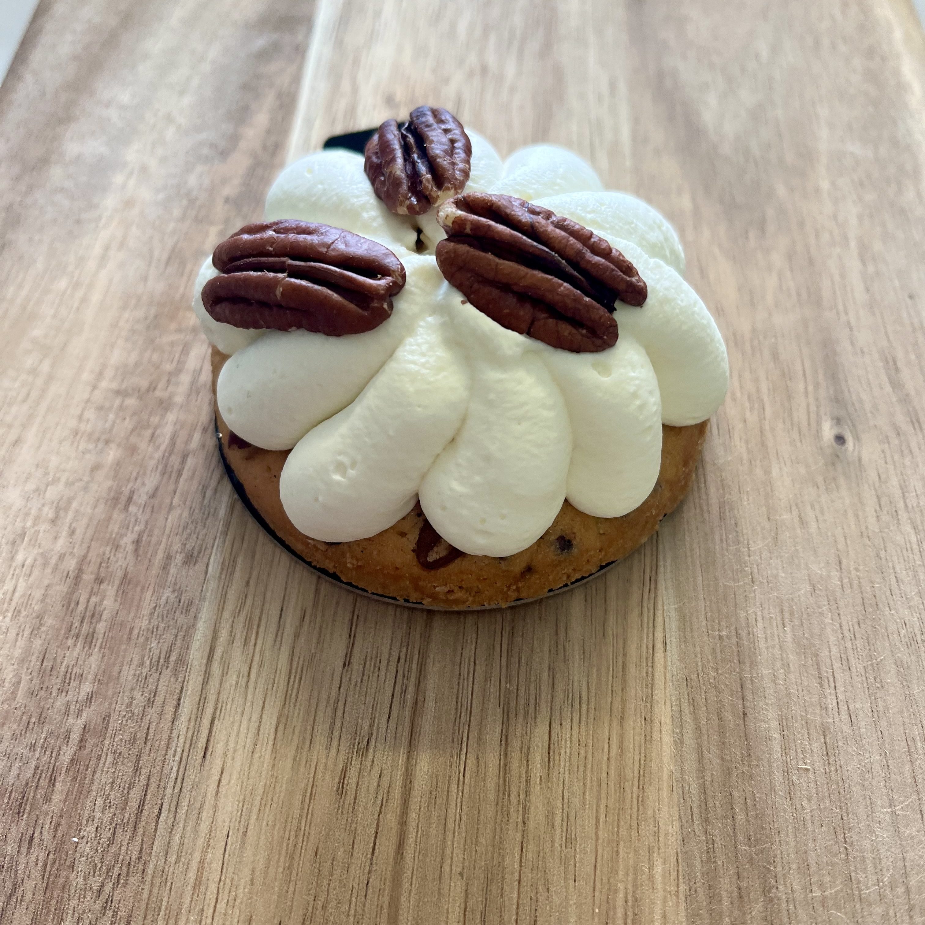 Base de cookies, crémeux vanillé, ganache montée vanille, noix de pécan