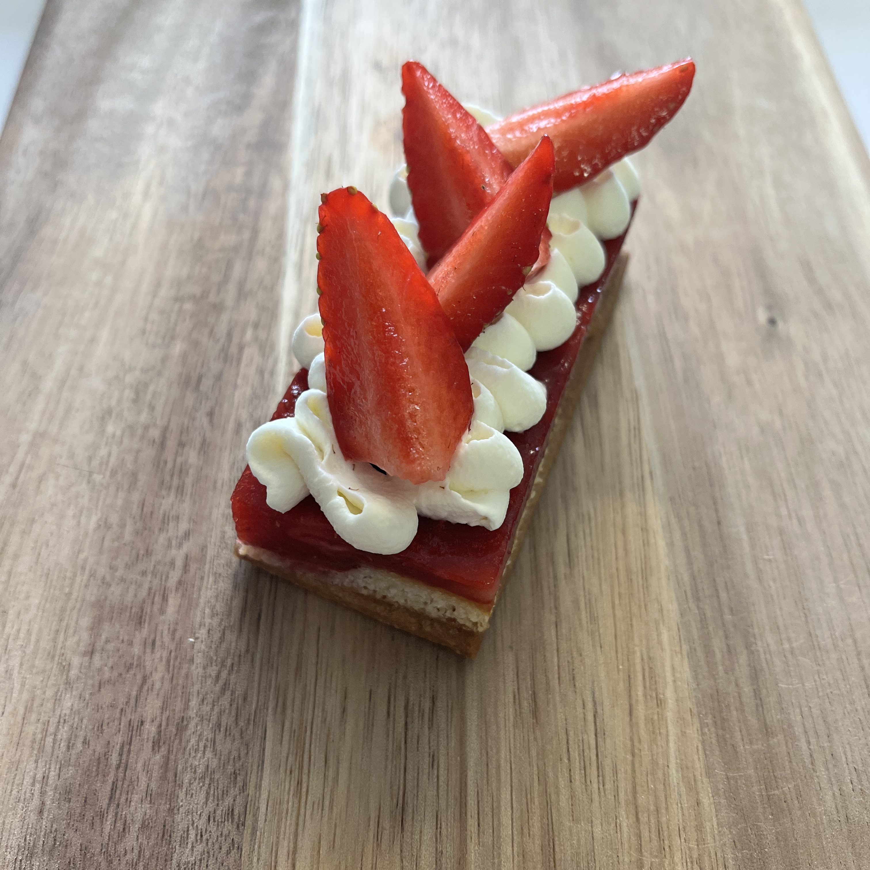 Biscuit financier amandes, confit fraise, chantilly vanille, fraises locales