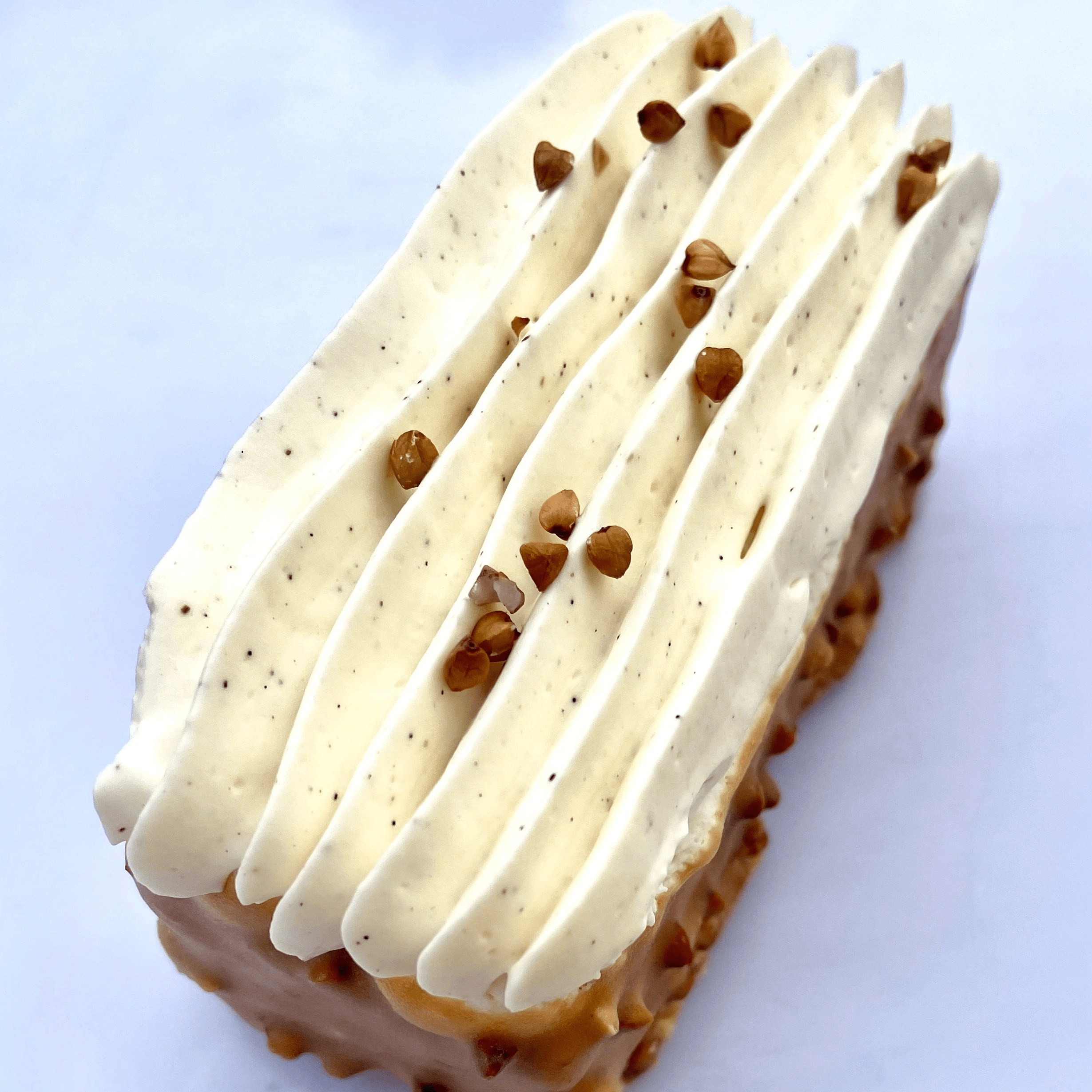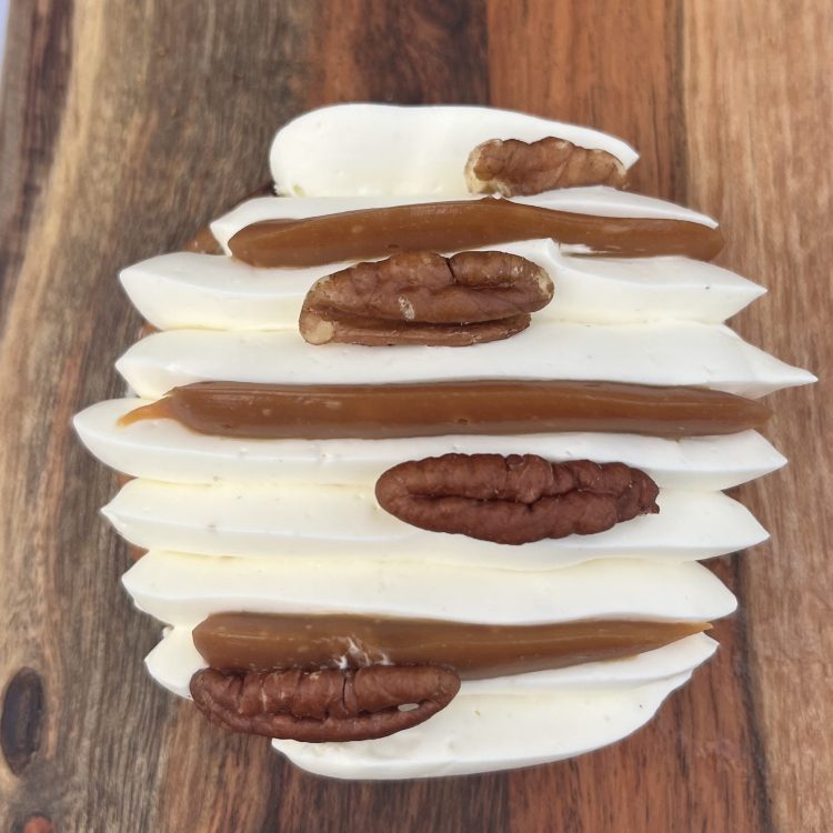 Cookies, crémeux vanille, caramel au beurre salé, ganache montée vanille, noix de pécan