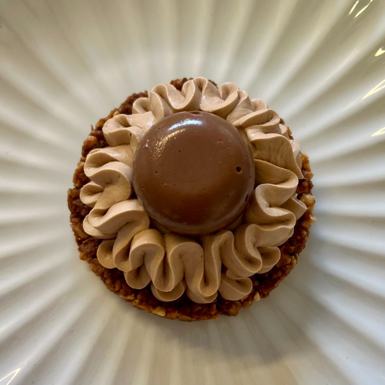 Sablé breton, ganache montée sarrasin, caramel au beurre salé, ganache montée vanille