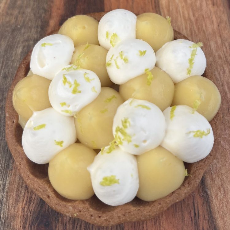 Pâte sablée, biscuit moelleux amandes, crémeux citron, ganache montée citron
