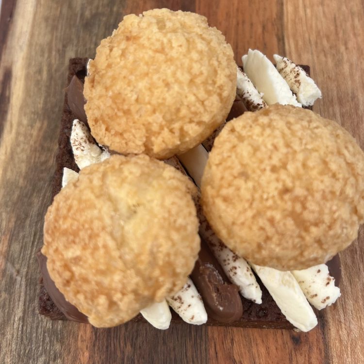Biscuit brownies, chou craquelin, crémeux chocolat, ganache chocolat, chantilly vanille