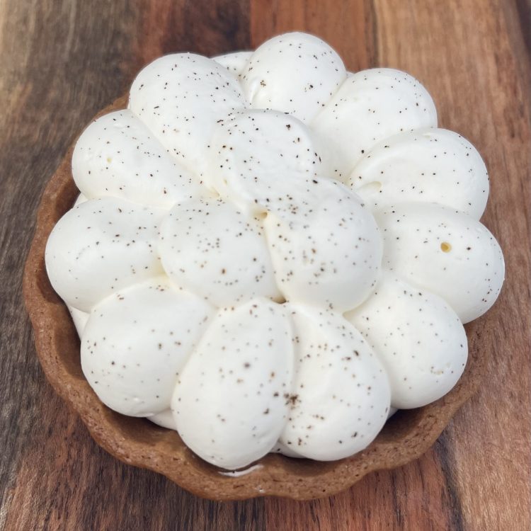 Pâte sablée, biscuit moelleux vanille, crémeux et ganache vanille, croustillant
